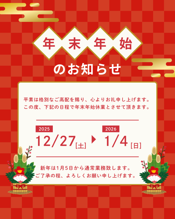 RSS(別ウィンドウで開きます) 一覧へ戻る 年末年始休業のお知らせ2025-12-19重要年末年始休業のお知らせ 平素は格別のご愛顧を賜り、厚くお礼申し上げます。さて、誠に勝手ながら弊社では下記の期間を休業とさせていただきます。期間中はご不便をおかけいたしますが、何卒ご了承くださいますようお願い申し上げます。 ■休業期間令和7年12月27日(土)~ 令和8年1月4日(日)※期間中にいただきましたお問い合わせにつきましては、休業期間後、1月5日(月)より順次対応させていただきます。